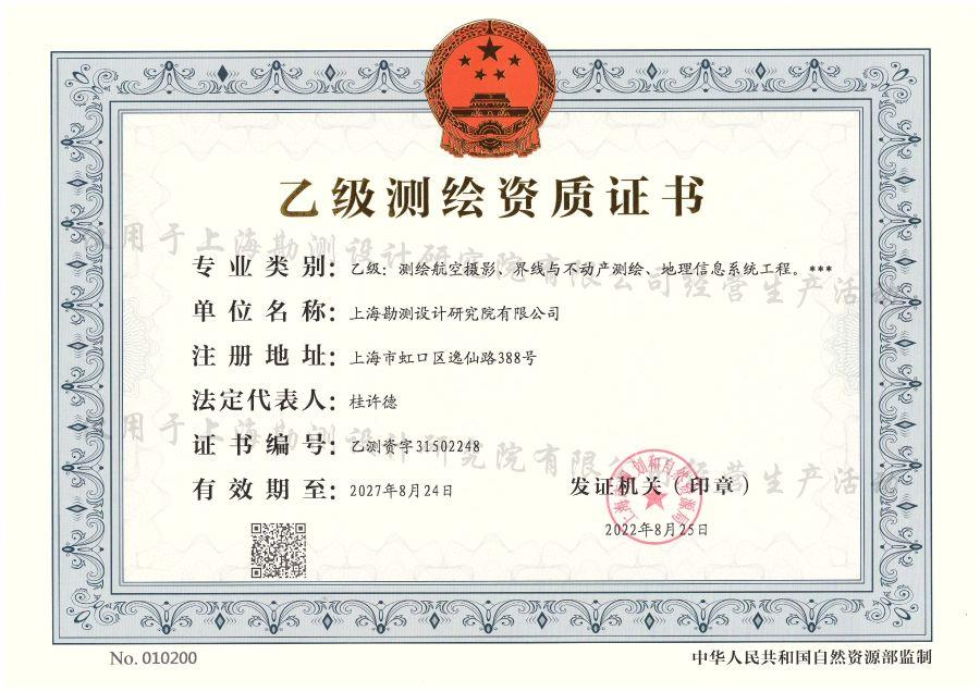 測繪乙級資質證書:測繪航空攝影乙級、地理信息系統工程乙級、界限與不動產測繪乙級