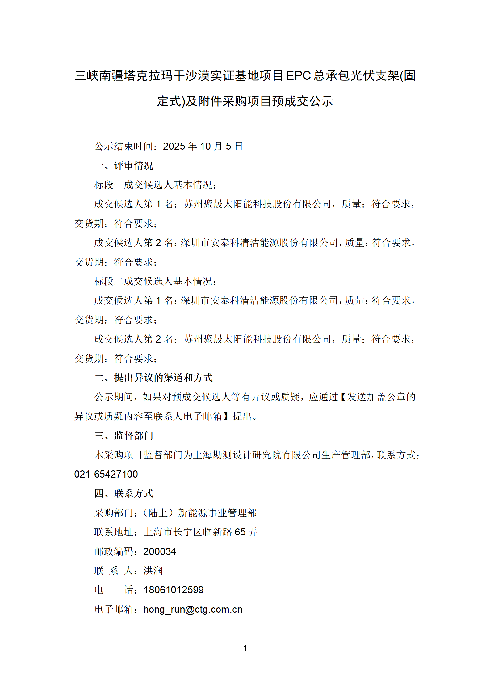 三峽南疆塔克拉瑪干沙漠實證基地項目EPC總承包光伏支架(固定式)及附件采購-預成交公示